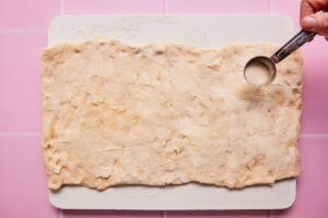 - Sprinkle 1 tablespoon of granulated sugar evenly on top of the buttered dough.