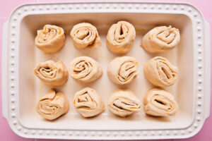 - We're going to quarter this dough. Slice the log of dough down the middle. Then slice each half in half so you have four orange rolls. Place the four orange rolls in the prepared baking dish.
