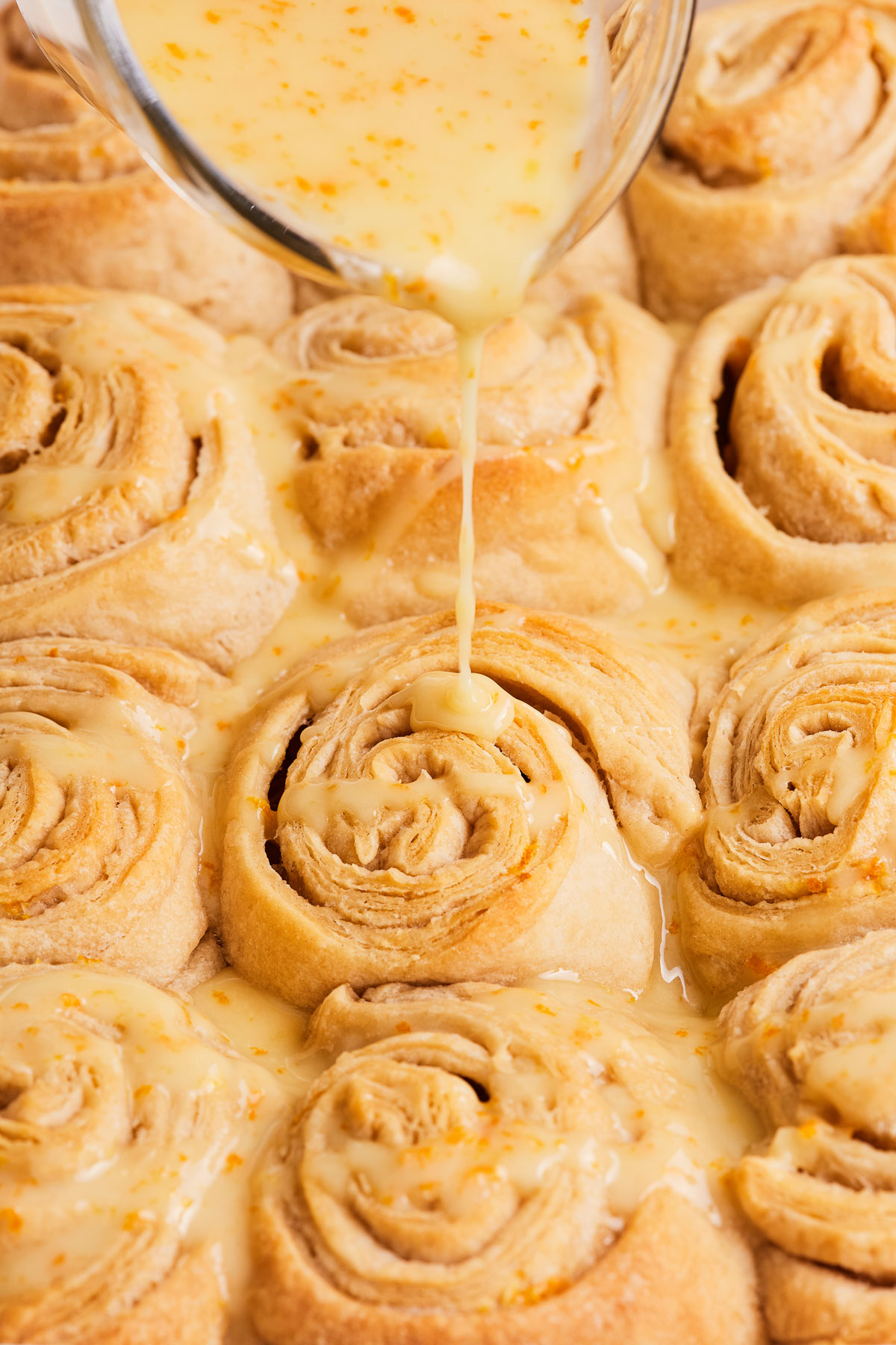 In a bowl stir together powdered sugar, orange juice, and orange zest. Pour over the finished orange rolls and serve immediately.