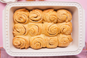 Spread softened butter evenly on top of the dough. Sprinkle granulated sugar and orange zest. Fold the rectangle of dough in half, from left to right. Now roll it from top to bottom to create a log. (Photos of this process are included in the recipe card below.) Slice into fourths. Now you have 4 rolls! Repeat with the remaining two tubes of crescent roll dough until you have 12 orange rolls. Place the rolls in a greased 9×13 baking dish. Bake for 25 to 30 minutes.