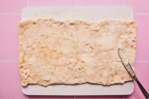 - With a knife spread 2 tablespoons of softened butter evenly on top of the dough.