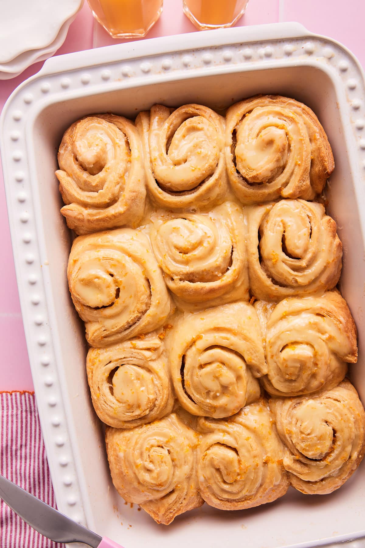 - After baking, remove the baking dish from the oven and let the rolls sit for 5 to 10 minutes to start to cool (they won't cool completely). Then pour the icing over top of the warm orange rolls and serve.