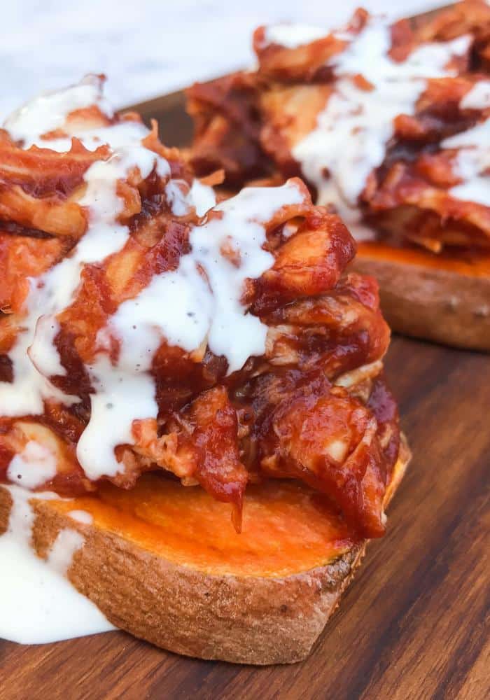 Does it taste like bread? No. It’s a sweet potato, silly. But it cooks fast in the toaster (yes, the toaster!) and you can load it up with all kinds of yummy goodness. Throw on some egg and veggies for a satisfying breakfast. Add some almond butter and apples for a sweet treat. There are so many good options! But today it’s all about this Barbecue Chicken on Sweet Potato “Toast”.
