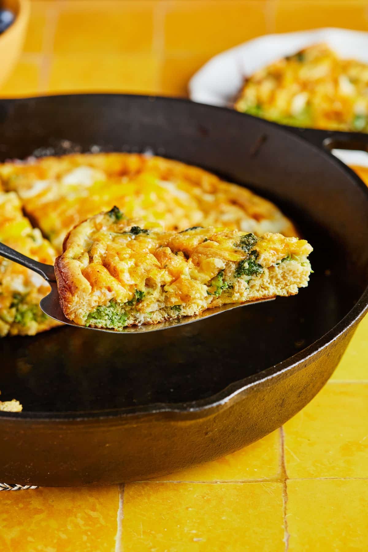 Having said that, you can absolutely use a pie plate or 10 x 10 baking dish instead. (I do not recommend a baking dish larger than 10 x 10 because the egg mixture will spread too far resulting in a very thin and likely overcooked frittata.) Since they can’t be used on the stovetop you’ll need to sauté the broccoli and onion in a skillet first and then transfer it to your baking dish once cooked.