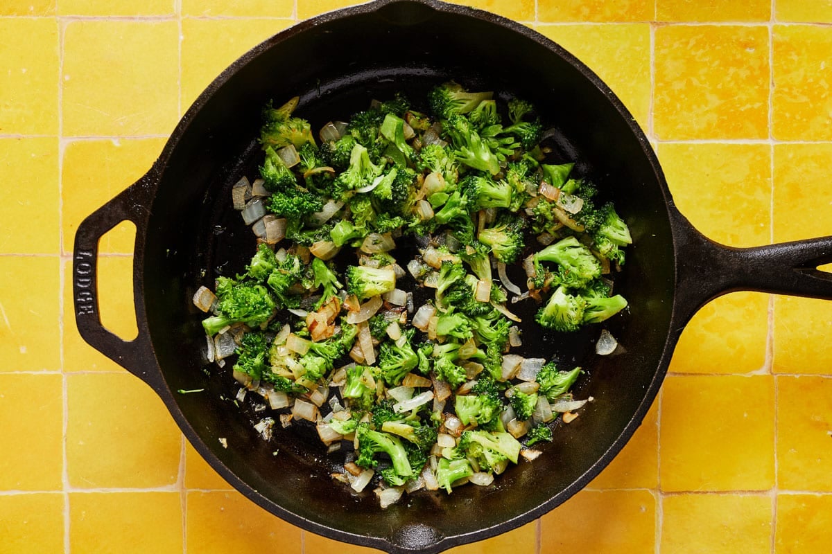 - Heat oil in a cast iron skillet on medium to medium-high heat. Once hot, add chopped broccoli and onion. Sauté until tender, stirring frequently, 3 to 5 minutes.