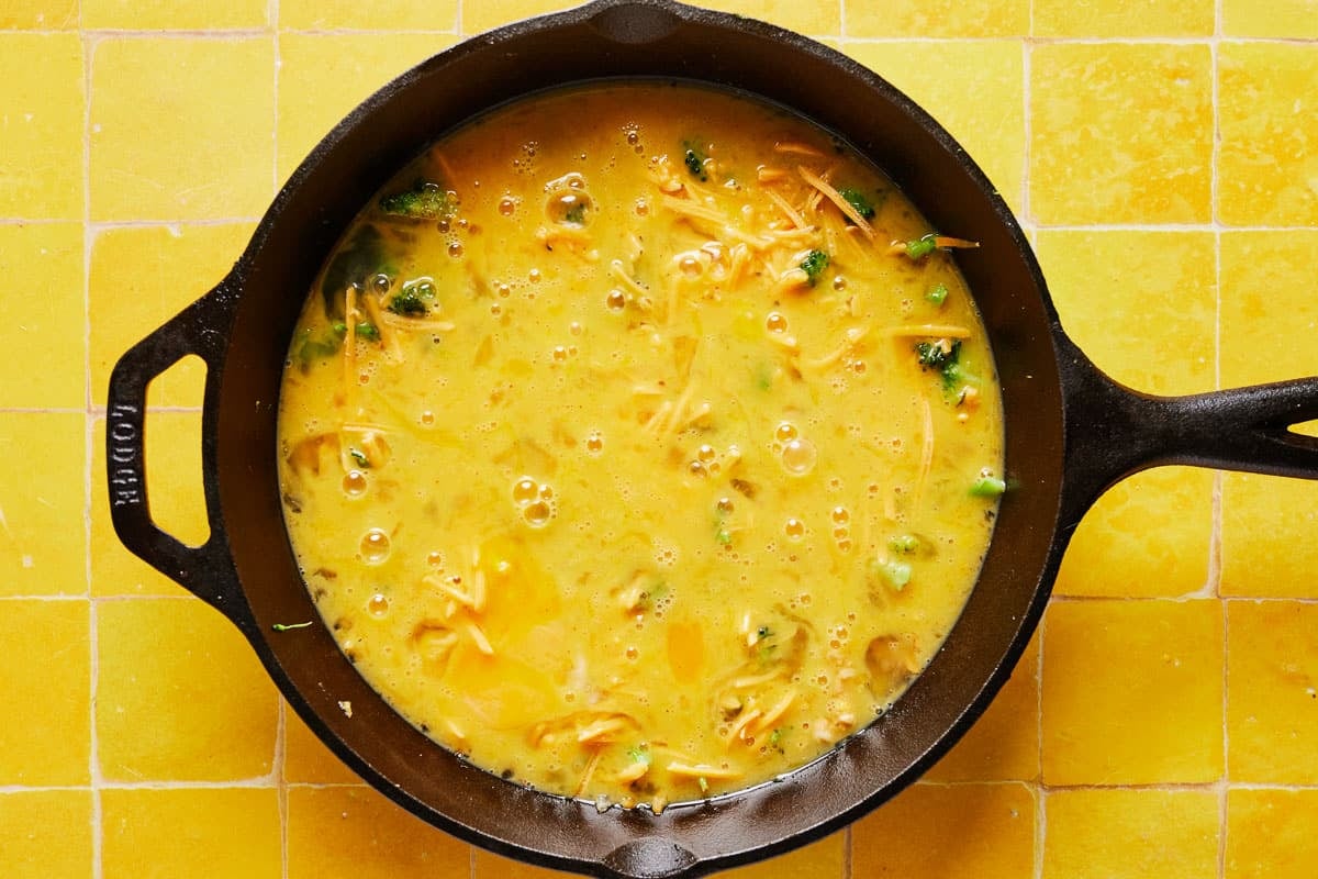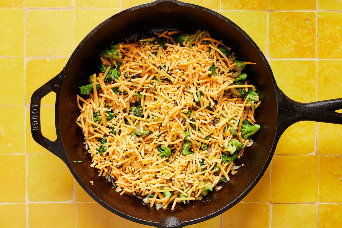 - When the broccoli and onion are done, turn off the stove. Spread the broccoli and onion mixture across the bottom of the skillet so they're evenly distributed. Layer the shredded cheese on top. Pour your egg mixture over everything.