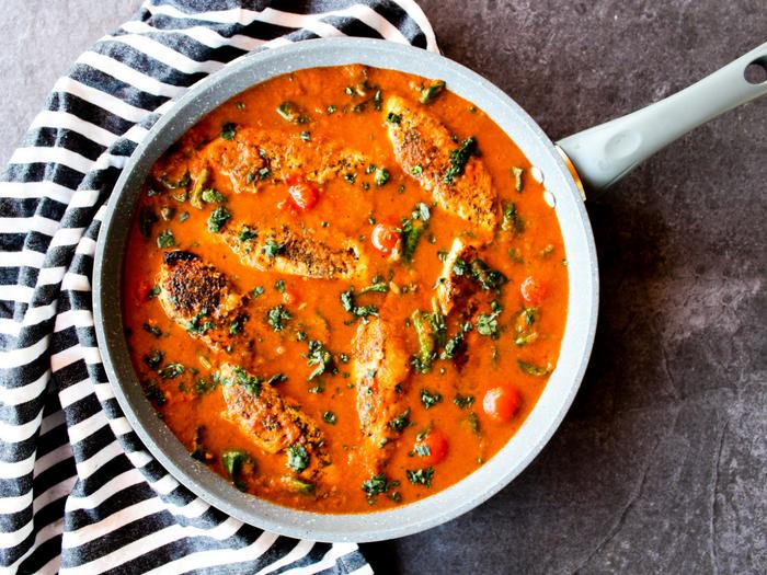 - Pour blended sauce into the pan. Add spinach and a handful of cherry tomatoes. Stir until spinach is mixed in with sauce. Add your chicken back to the pan. Reduce heat to medium low or low. Cover and simmer for 5 minutes so sauce is heated through and cherry tomatoes are softened.