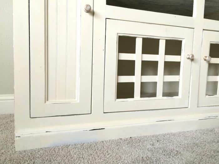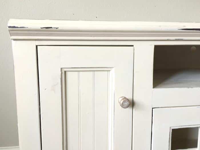 It was brown. Chipped. Scratched. At some point a candle had overheated on the top so it’s sported a big circle for years that I covered with a lamp. The final straw for me was when a latch that secured the glass in one of the doors broke. This resulted in a door having no glass while the other did. Just keeping it classy here, folks.