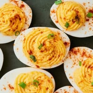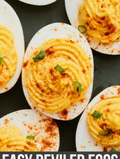 These classic deviled eggs are made with hard boiled eggs, mayo, mustard, salt, pepper, and paprika. It’s an easy appetizer perfect for the holidays, Easter, brunch, or a potluck.