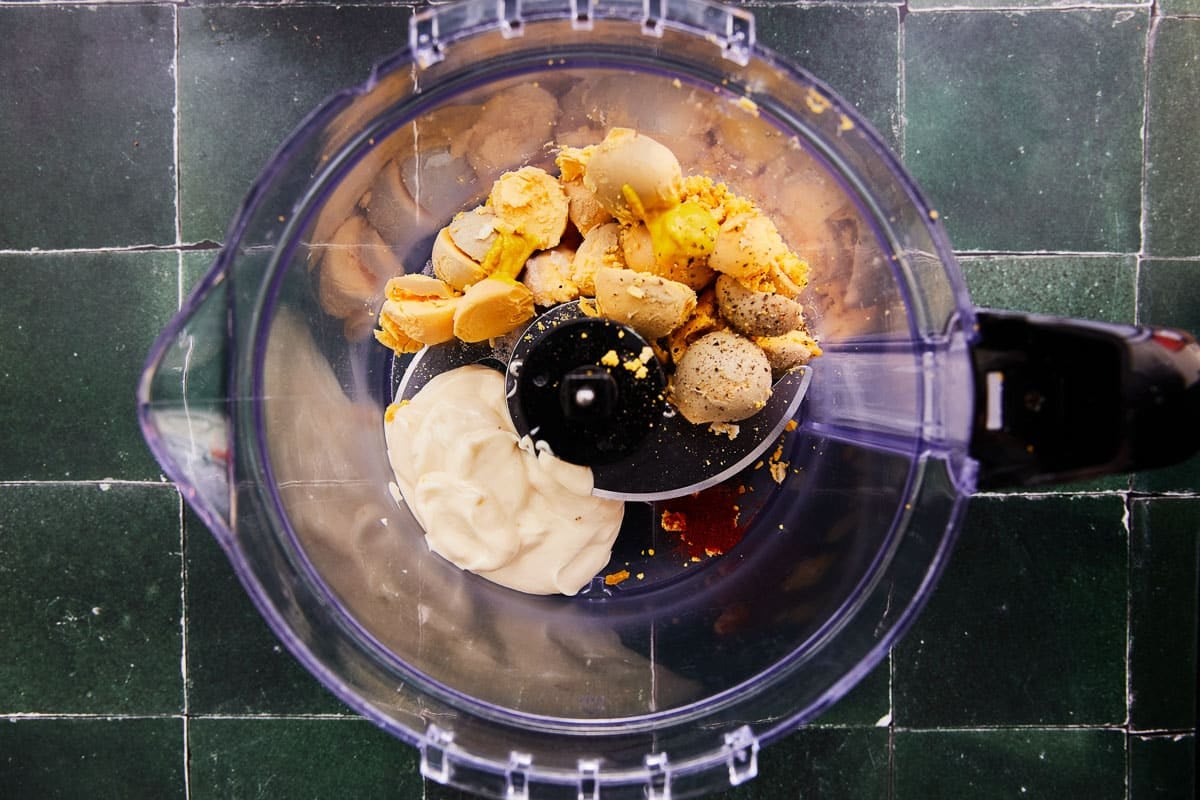 - Use a fork to smash the yolks until they're crumbled. Then stir in mayo, mustard, paprika, salt, and pepper until well combined and smooth. (For an extra creamy filling use a food processor to combine the filling ingredients.)