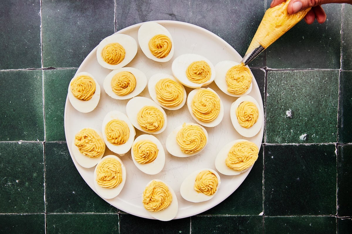 - Use a piping bag to add the filling to the center of the egg white halves (or use a spoon to scoop the filling in). Sprinkle with extra paprika before serving.