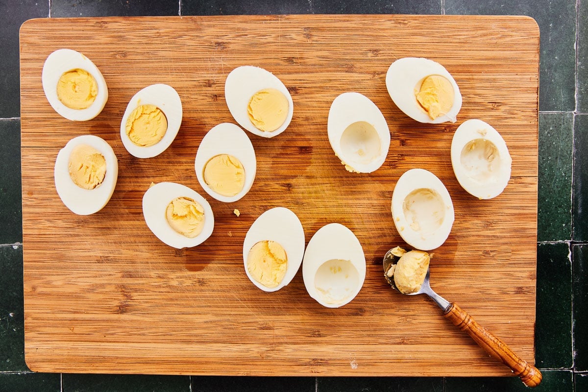 - Peel the eggs. Slice in half lengthwise. Use a spoon to gently remove the yolks from the egg halves and add the yolks to a medium bowl.