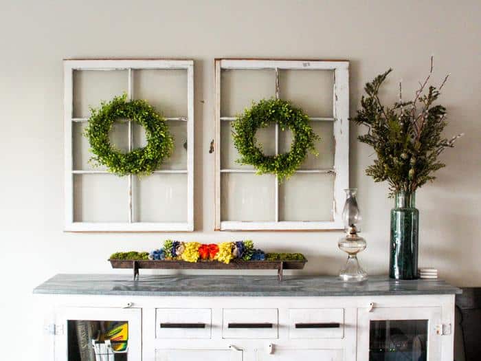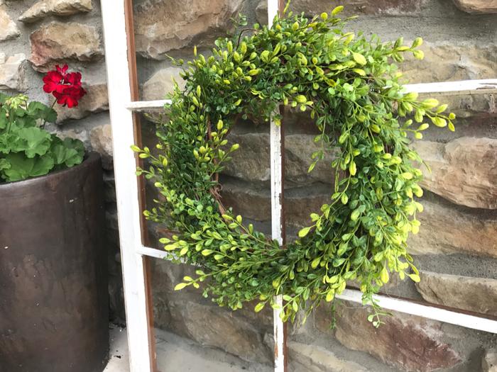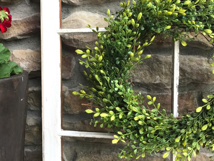 As I began decorating our new home I knew that I wanted to hang two window panes with boxwood wreaths in the center of each. When I priced them out I saw that I could easy spend $50 – $75 per wreath. Ummm that’s a no.