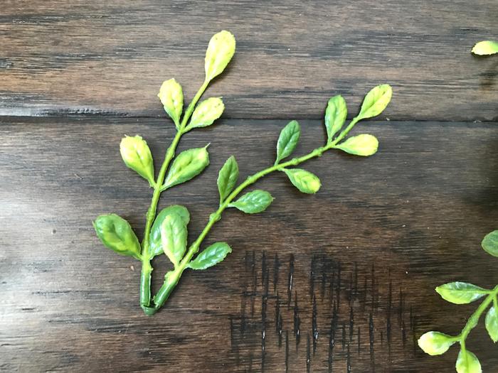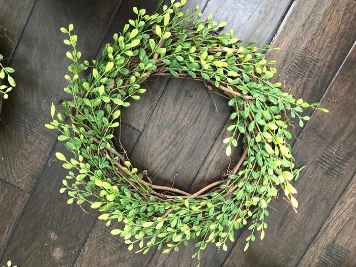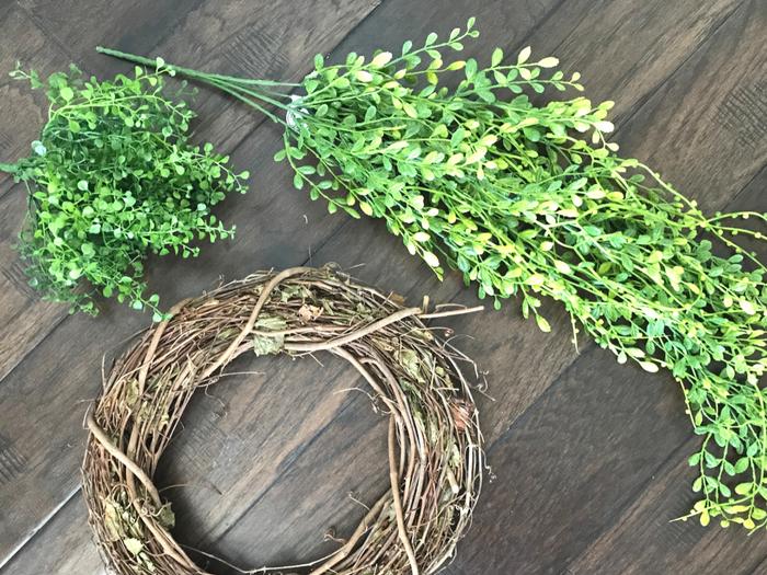 - Plastic greenery. Any good craft store will have lots to choose from. Mine is from Hobby Lobby and they have several aisles of it. Choose very small leaves to achieve the boxwood look. You can go with long strands or with the smaller bushes. Just make sure that you can easily pull the stems off. I did a mix of both a strand and two bushes. They were $7.99 each at full price but of course it’s Hobby Lobby so they were 50% off (they go on sale every other week) which brought my greenery total to $10.50.