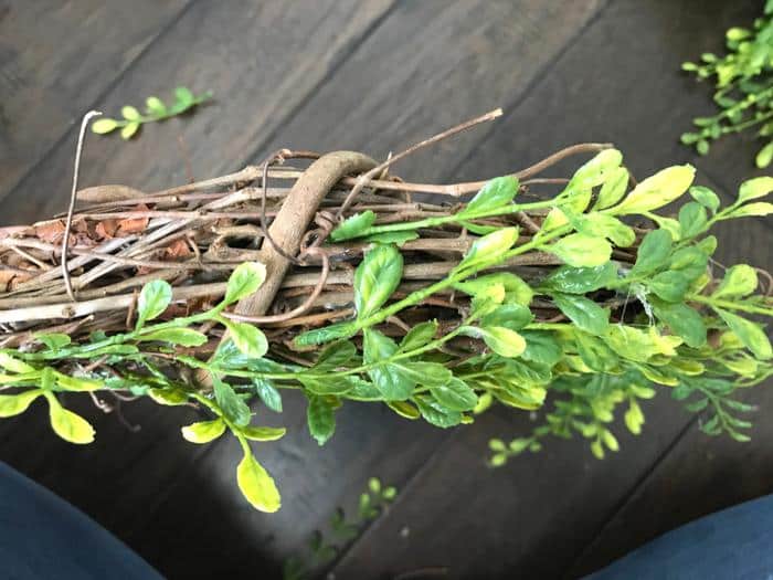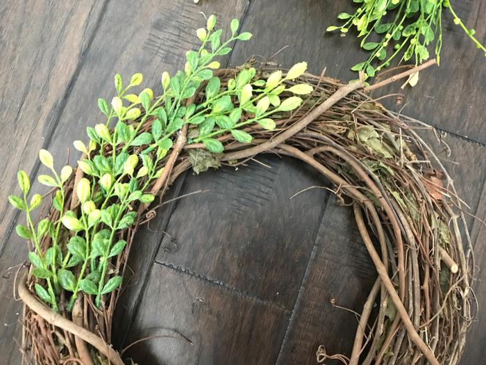 Glue each strand to the front of your wreath so they all go in the same direction. This creates that boxwood look. Continue until you’ve achieved the fullness you’re looking for.